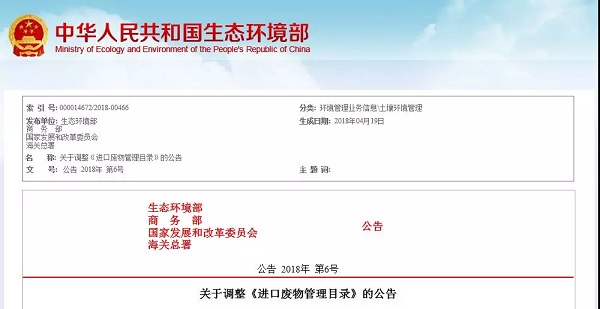 4月19日上午,生态环境部办公厅印发了关于调整《进口废物管理目录》的公告。