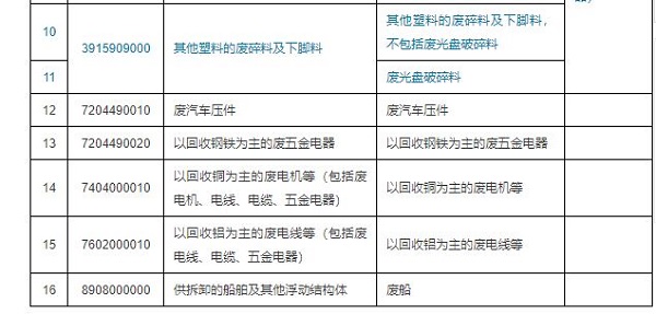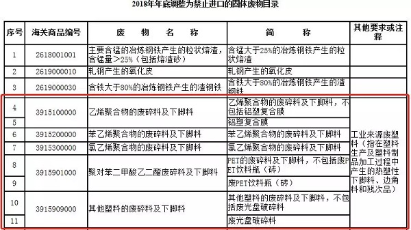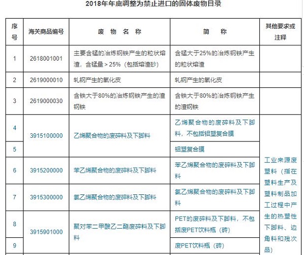 一、将废五金类、废船、废汽车压件、冶炼渣、工业来源废塑料等16个品种固体废物(见附件1),从《限制进口类可用作原料的固体废物目录》调入《禁止进口固体废物目录》,自2018年12月31日起执行。