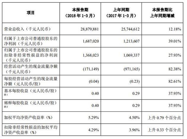 4月27日晚间,中兴通讯(31.310, 0.00, 0.00%)(000063,SZ)发布的一季报显示,公司今年一季度营收为288.80亿元,同比增长12.18%;实现归属于上市公司普通股股东的净利润为16.87亿元,同比增39.01%。
