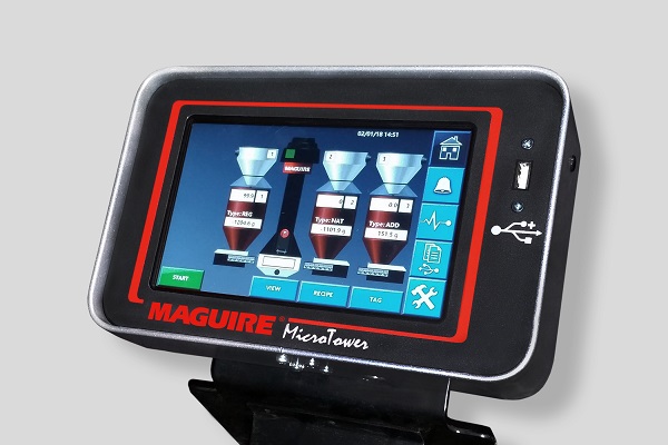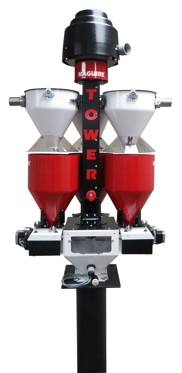 Maguire®MMT微型塔式机最多可混合三种物料(例如原生树脂、再生料和母料),用于注塑成型或挤出工艺时每批次的重量为10磅(4.5千克),混料量最高可达每小时100磅/45千克。小巧的塔式机安装在加工机械的进料口,不必占用地面空间来放置真空泵。为了确保精度,上料机和三个料斗在控制器的同时指示下采用失重控制机制运行。