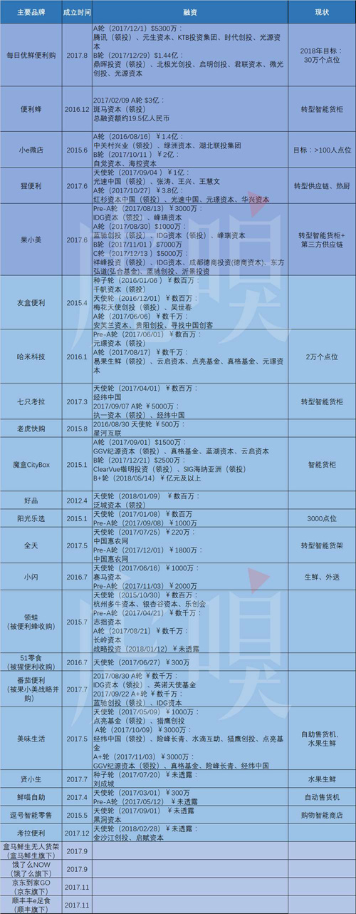 2017年8月底,果小美完成超过1000万美元的A轮融资,而就在半个月之前,果小美还获得过IDG资本领投的超3000万元的Pre-A轮融资;2017年11月,猩便利获得3.8亿元A1轮投资,两个月内,猩便利就融了近5亿元;创立于2016年12月的便利蜂,2017年2月就完成A轮3亿美元的融资......