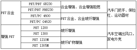 PET材料有极佳的韧性,且具有优良的抗疲劳性、耐热、耐候性、电性能、低吸水率等特性。对其进行增强、阻燃改性,可以显著提高其耐热性、模量、尺寸稳定性及阻燃性,广泛应用于汽车行业。