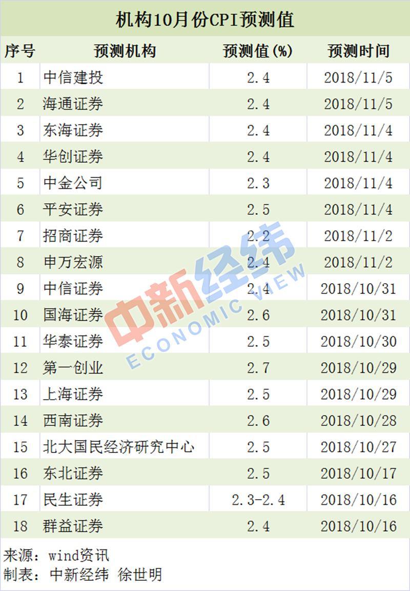 Wind资讯数据显示,18家机构对10月CPI进行预测,仅3家机构预测值高于2.5%,多数机构认为10月CPI涨幅不高于2.5%,或小幅回落。