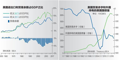 2017年年末,公众持有的美国国债达到12.3万亿美元,超过美国GDP的60%,其中超过一半(6.3万亿美元)都是由外国投资者所持有。外国持有的美国国债量在美国贸易赤字扩大的过程中持续上升。