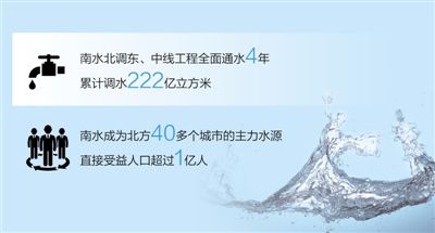 自南水北调中线一期工程于2014年12月12日正式通水至今,南水北调东、中线已全面通水4周年,截至目前累计调水222亿立方米;工程在受水区供水安全、水生态保护、地下水超采治理上发挥了重要作用,有力支撑了受水区经济社会发展。
