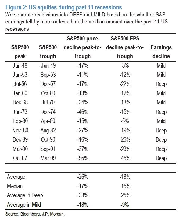 摩根大通策略分析师 Nikolaos Panigirtzoglou指出,评估美国经济衰退程度最简单的方法是利用过去11次衰退中标准普尔500指数平均26%的跌幅。