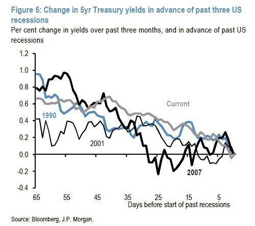 Panigirtzoglou认为国债市场(特别是5年期国债)也在传递类似的衰退信息: