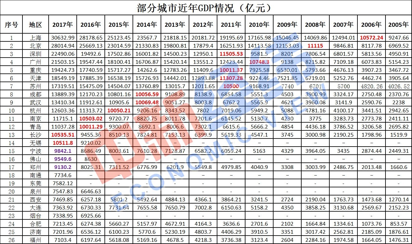 2017年已有14个城市GDP进入“万亿俱乐部”。上海、北京、广州GDP总量分别在2006年、2008年、2010年突破万亿;2011年,深圳、重庆、天津、苏州的GDP总量跨进万亿行列;2014年,成都、武汉GDP总量突破万亿;2015年,杭州GDP总量突破万亿;2016年,南京和青岛GDP总量超过万亿;2017年,无锡和长沙GDP总量均突破万亿。