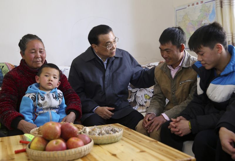 图为2017年1月23日,李克强总理来到云南鲁甸甘家寨村民甘永荣家,得知小伙子被拖欠一年多工资,总理当即说,决不能让农民工背井离乡流汗再流泪。