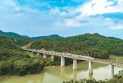 图为2018年9月23日,一列从香港西九龙站出发的港铁动感号从深圳高峰水库特大桥上驶过。当日,广深港高铁全线正式开通运营,内地与香港两地高铁实现互联互通。本报记者 史家民摄