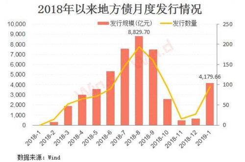 Wind数据显示,自新疆1月14日率先披露100亿元地方债发行文件后, 1月21日开始,2019年地方债发行正式拉开序幕。1月份短短10天左右的时间共有95只地方债已经发行完成,合计募资4179.66亿元。相对于2018年1月没有一只发行变化巨大,此外该发行规模已经超过去年第四季度发行的总和。