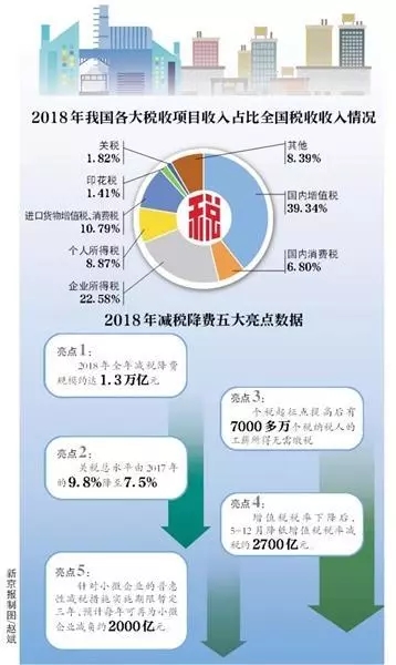 增值税税率下调、个税起征点提高等举措,全年减税降费约1.3万亿元;增值税税率或由三档并两档