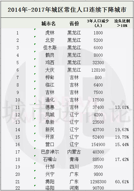 单纯以2014年-2017年间城区常住人口的变化情况来看,666个城市中有22个城市呈现出连续三年下降的情况。