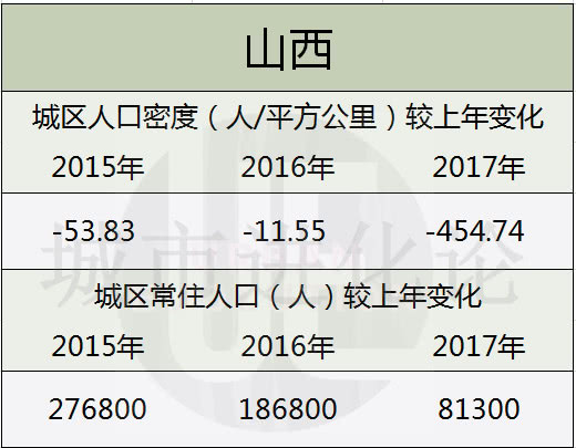 值得一提的是,山西省是唯一一个人口密度三年内持续降低的省份,同时其城区常住人口是连年增长。可见,这三年中,山西省整体土地的城镇化恐怕要快于人的城镇化。