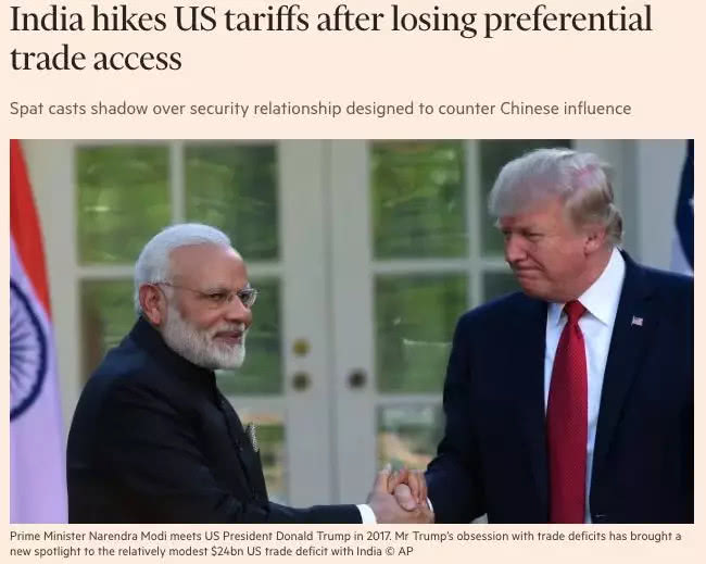 印度财经媒体Mint网站14日分析认为,印度宣布对美征收报复性关税的时间节点值得玩味,因为莫迪和特朗普即将在G20大阪峰会上举行会晤,美国国务卿蓬佩奥也将在G20前访问印度。而印度商工部长戈亚尔13日刚刚表示,美国取消印度GSP地位,对印度来说并非“生死攸关的大问题”。