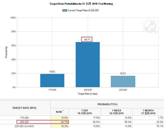 芝商所“美联储观察工具”对2019年6月和7月联邦基金目标利率的预测。图片截自芝加哥商业交易所