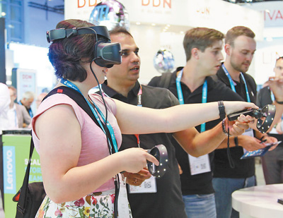 参观者在联想集团展台前体验虚拟现实(VR)设备。