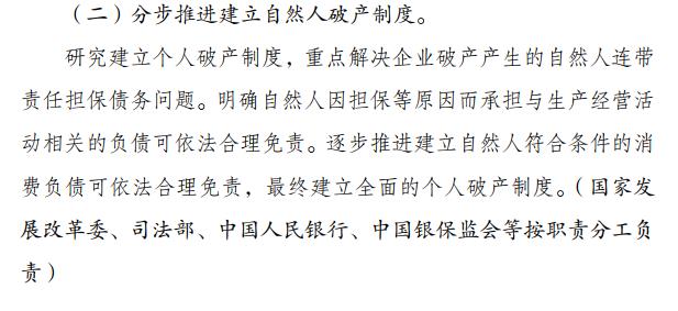 在此次《方案》中明确指出,重点解决企业破产产生的自然人连带责任担保债务问题。明确自然人因担保等原因而承担与生产经营活动相关的负债可依法合理免责。逐步推进建立自然人符合条件的消费负债可依法合理免责,最终建立全面的个人破产制度。
