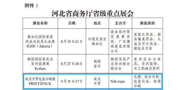 由Nile expo主办的埃及开罗包装印刷展PRINT2PACK被纳入省级重点展会;